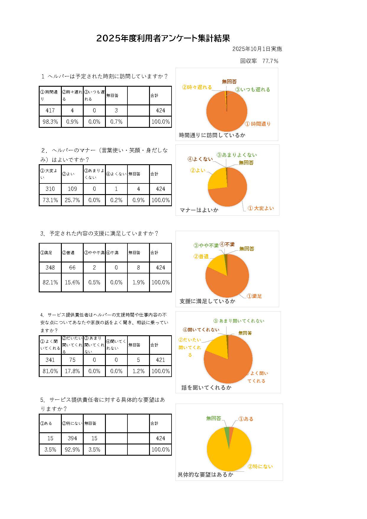 三多摩福祉会の訪問介護事業所では毎年ご利用者さまにアンケートを実施し、事業所運営の参考にさせていただいています。訪問介護8事業所で実施し、2025年度も8割近くのご利用者さま・ご家族に回答していただきました。アンケート結果はこちらです👇
